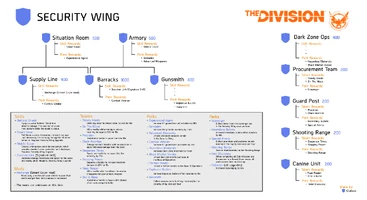 Una vez desbloqueado hay diez posibles mejoras en el ala de seguridad, cada uno que requieren recursos para el suministro de seguridad para construir. Estos recursos pueden ser adquiridos a través de completar las misiones de seguridad o encuentros de seguridad.