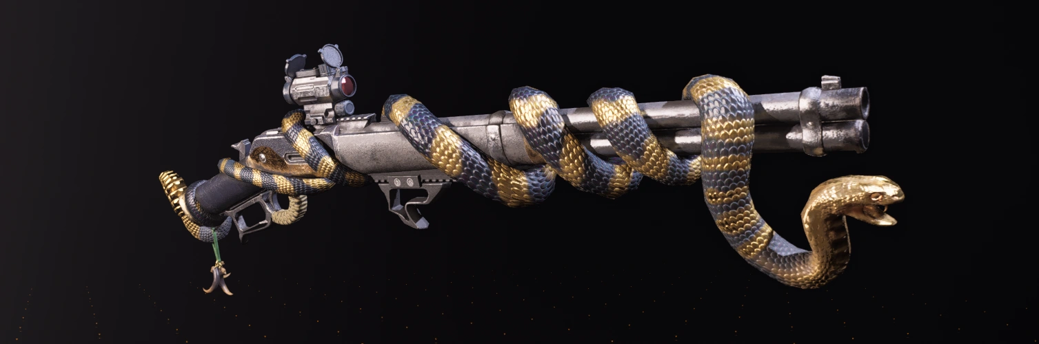 Diamondback est une variante exotique du fusil "1886". Elle est unique en son genre, son optique et son double canon la plaçant à mi-chemin entre un fusil à pompe et un fusil de précision. La crosse et la chambre semblent avoir vécu, tandis que tout autour de l'arme est enroulé un crotale dont les zébrures alternent entre le noir et le jaune, et dont la tête se relève au niveau du canon.