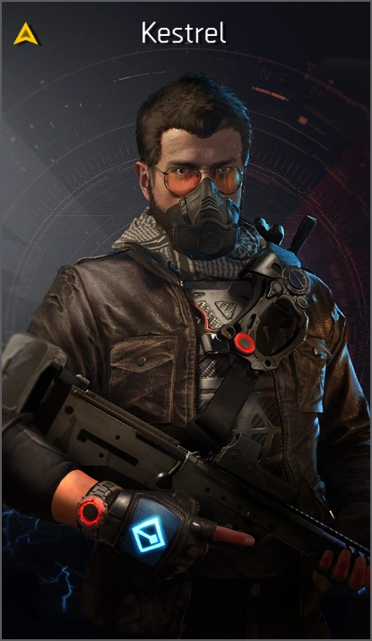 In-game, Kestrel was a Rogue Agent armed with an M1A CQB, ACS-12, Defender Drones, Mender Seeker-Mines and Shock Grenades.