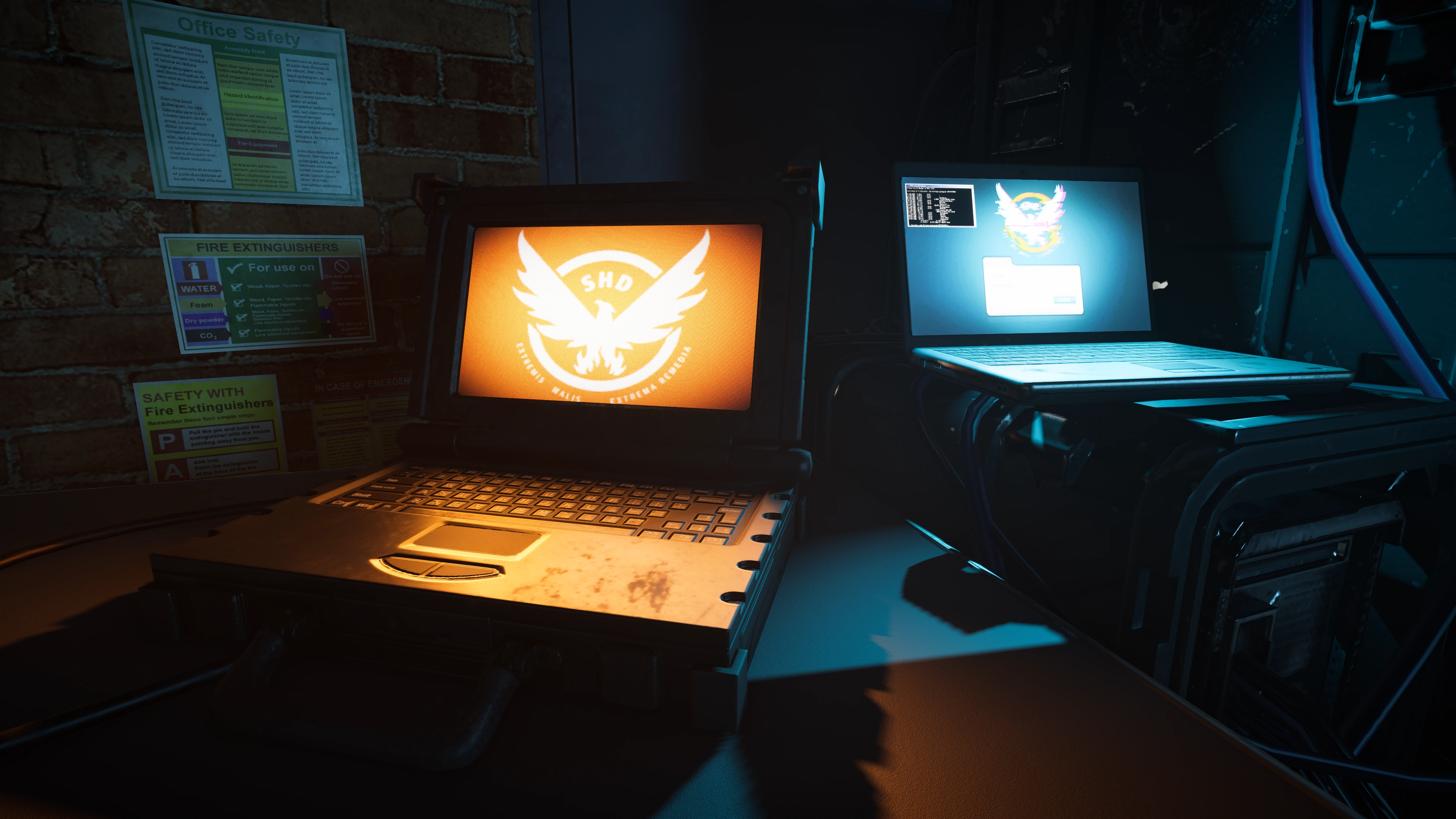 In-game, the back of the server has the Strategic Homeland Division's phoenix insignia. On the front, it has a keyboard and the screen shows a loading screen with SHD's insignia alongside its motto and an orange background.