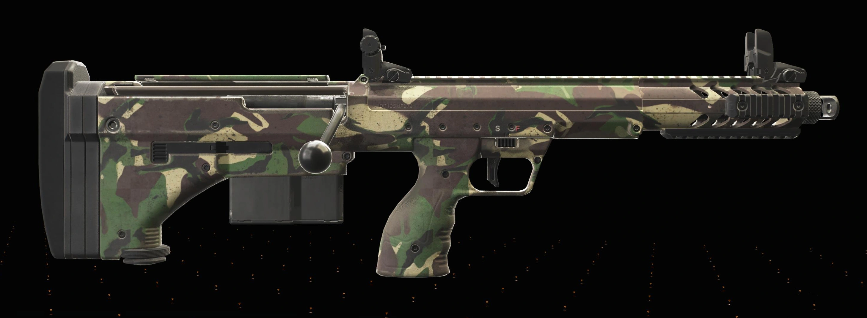 An Exotic variant of the Covert SRS, fitted with a bespoke silencer and covered in ghillie netting for woodland camouflage.