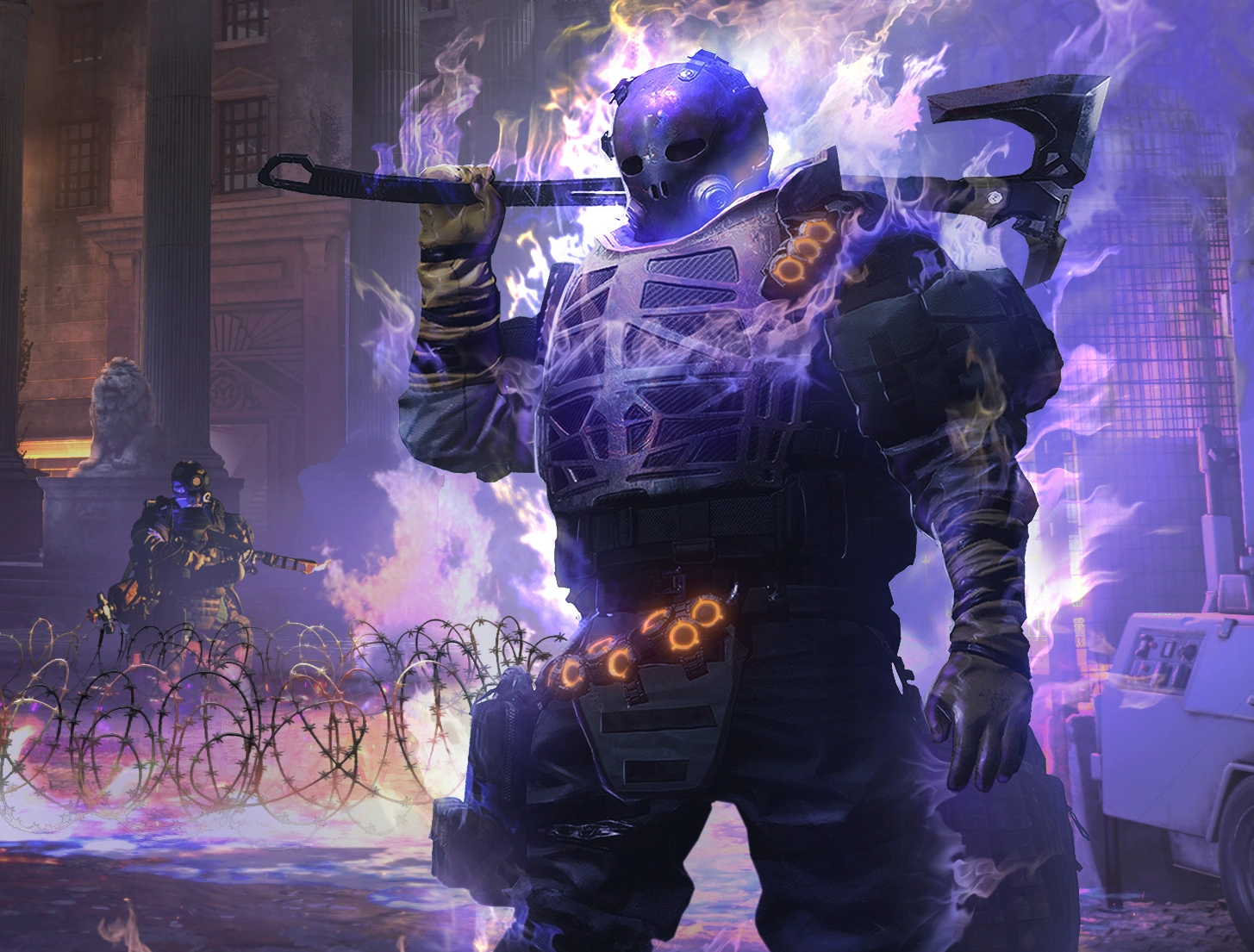 - In the Brooklyn: Hostiles comm "Meret" from the Battle for Brooklyn DLC, it was confirmed that Wright's armor was designed with regular Cleaner gear, but lined with the heat guard and coated in Matthew Grant's proprietary fire retardant. The main flaw that Wright's armor ignites a chemical reaction that goes volatile when getting wet, which proved to be his downfall when the Division eliminated him using the emergency water sprinkles against him.